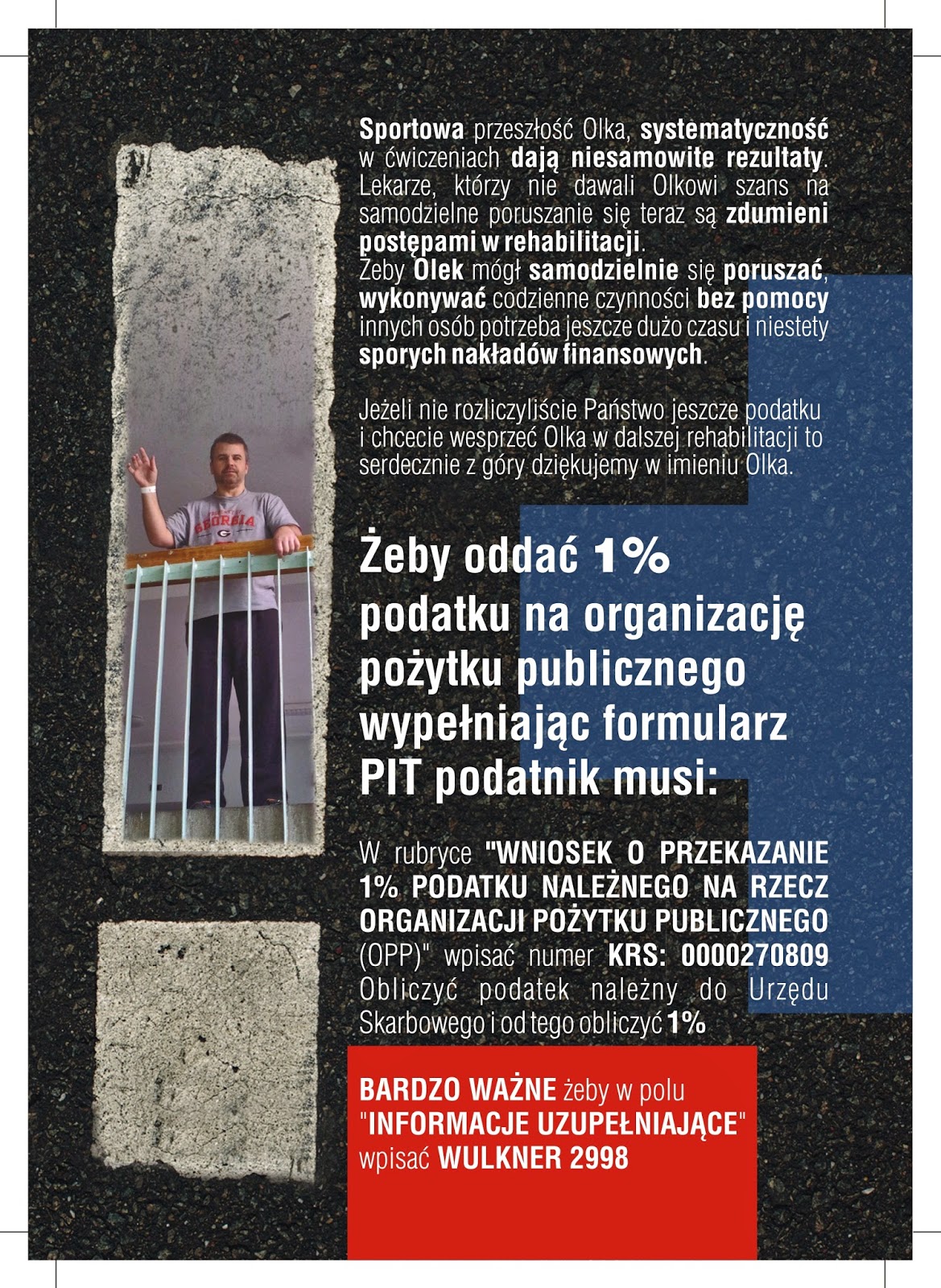 Żeby oddać 1,5% podatku na organizację pożytku publicznego wypełniając formularz PIT podatnik musi: - W rubryce "WNIOSEK O PRZEKAZANIE 1,5% PODATKU NALEŻNEGO NA RZECZ ORGANIZACJI POŻYTKU PUBLICZNEGO (OPP)" wpisać numer KRS: 0000270809 - Obliczyć podatek należny do Urzędu Skarbowego i od tego obliczyć 1,5% - BARDZO WAŻNE żeby w polu "INFORMACJE UZUPEŁNIAJĄCE" wpisać WULKNER 2998